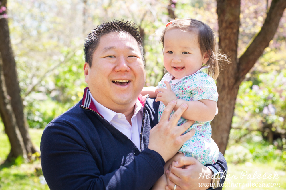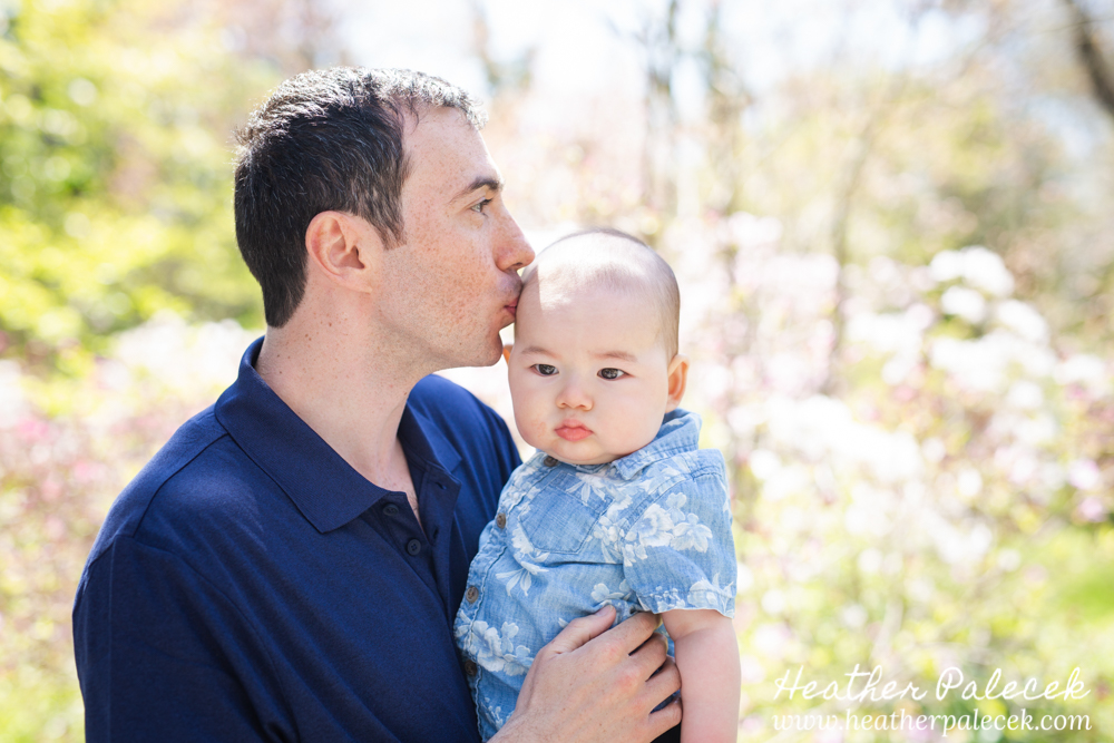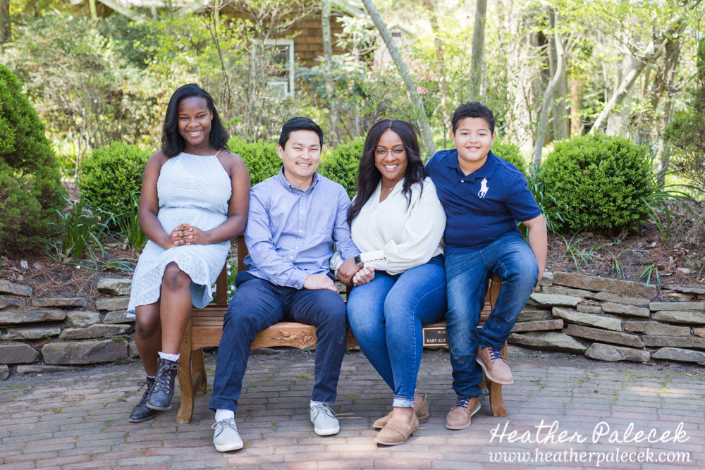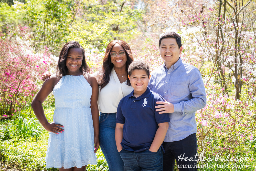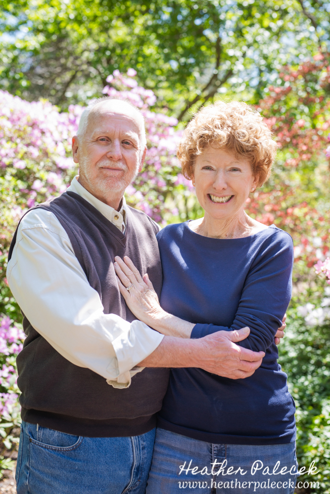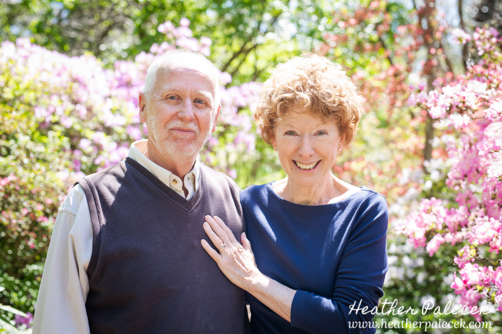 Her daughter and I worked to plan out the portrait session together. She chose Sayan Gardens in Hamilton, NJ as the location because it had special meaning to their mom and they haven’t been there as a family in many many years. We picked a great day to get together too, right before mothers day as the azaleas were in bloom, with perfect weather and bright sun! The whole family wore shades of blue within their outfits that really complimented one another and contrasted well with the bright pink flowers and green leaves in every background.